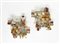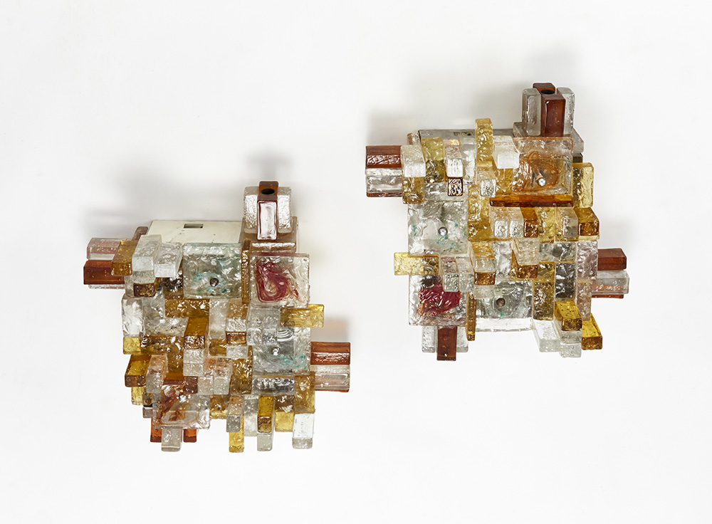 Coppia di lampade da parete in metallo e elementi di vetro massello incolore e ambrato. Italia, anni '70. (cm 51x51) (difetti e mancanze)