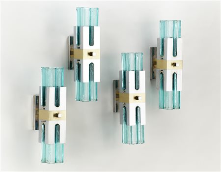 Lotto di quattro applique con struttura in ottone, metallo cromato e vetro verdino soffiato in stampo. Italia, anni '70. (cm 8x38x17) (lievi difetti)