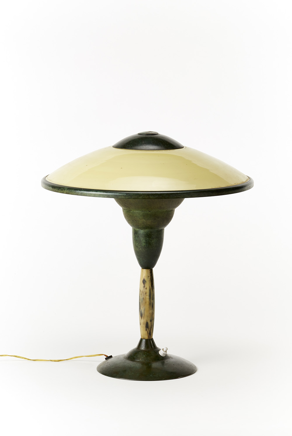 Table lamp with cast and brass plate structure, ocher incamiciato glass lampshade, bone-covered handle. Italy, 1920s. (h 42 cm.; d 36 cm.) (defects and losses)