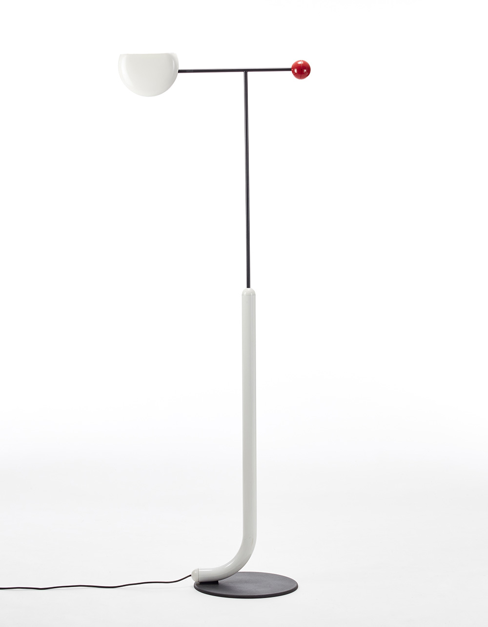 Lampada alogena da terra modello "Tomo". Produzione Luci, 1985. Basamento in ghisa verniciata nera, corpo verticale smaltata in bianco, bacchetta in metallo verniciato nero, sfera in plastica rossa e diffusore in alluminio verniciato bianco. (h cm 178) (lievi difetti)