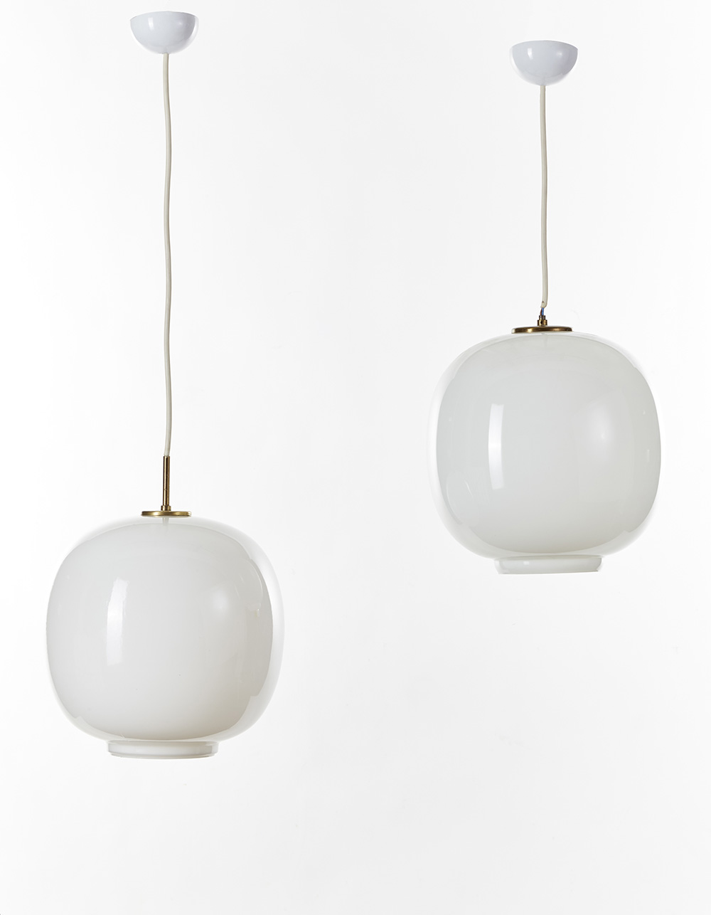 Pair of hanging lamps with incamiciato lattimo glass diffuser. Italy, 1980s/1990s. (h 92 cm.; d 34 cm.) (slight defects and restoration)