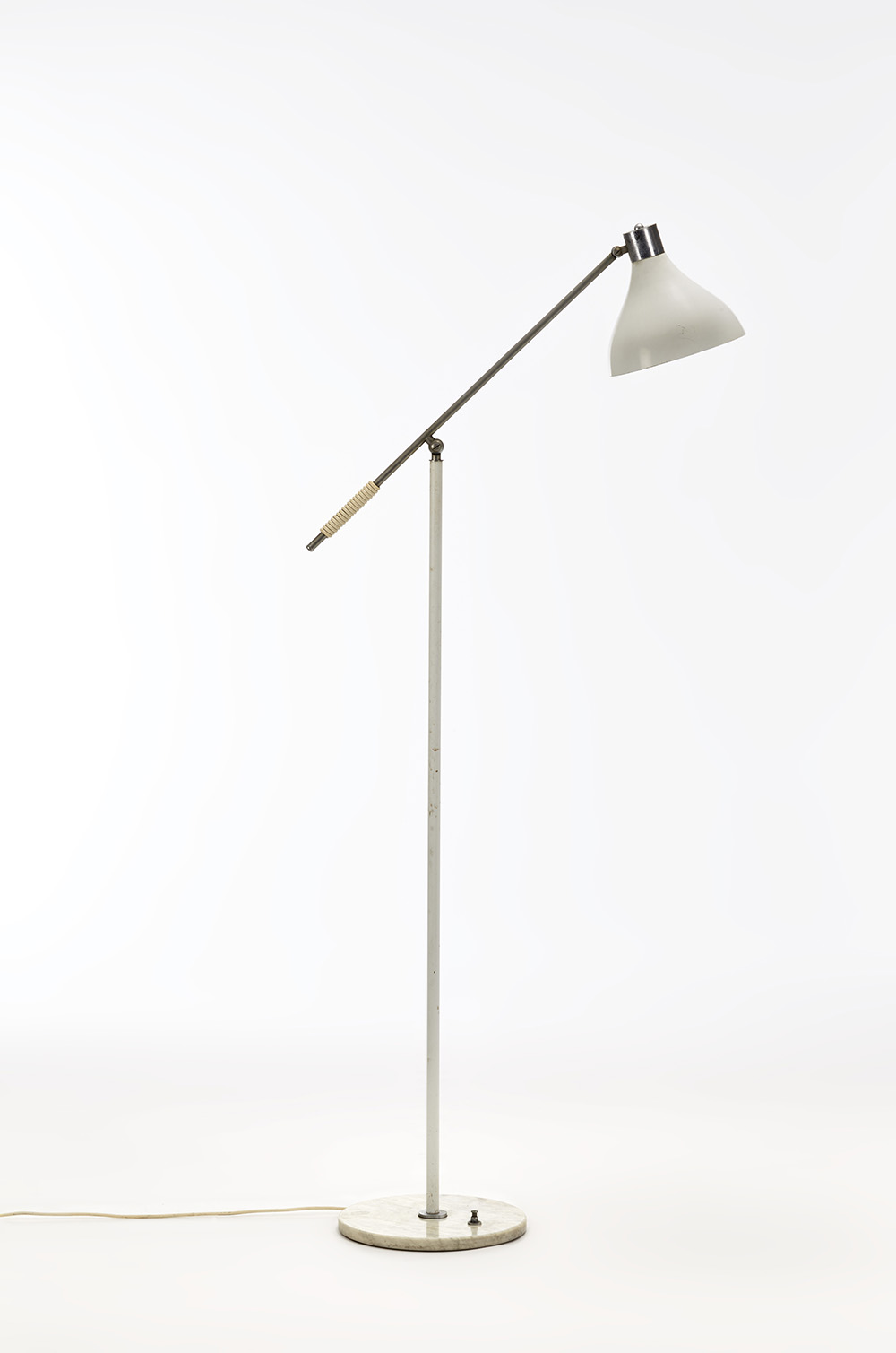 Lampada da terra con struttura in metallo laccato bianco e cromato, base in marmo di Carrara e paralume in alluminio laccato bianco. Italia, anni '70'/80. (h max cm 184) (lievi difetti)