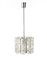 * Chandelier with chromed metal frame and gray molded steel with eight cylindrical pendants in corrugato blown colorless transparent Murano glass. Italy, 1970s. (h 98.5 cm.; d 36 cm.)