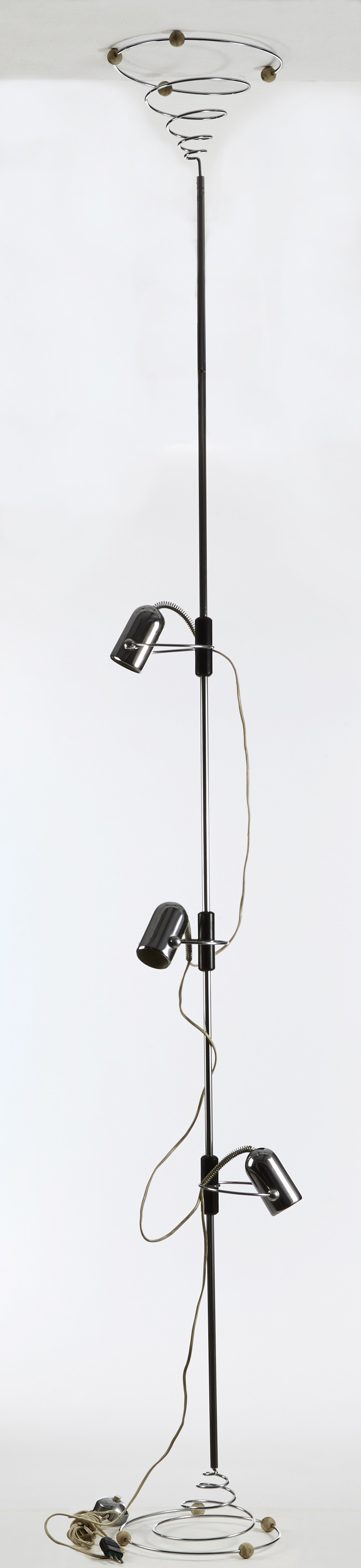?Lampada da terra a soffitto a tre faretti modello "Cielo Terra". Produzione Reggiani, anni '60. Acciaio cromato e plastica. (altezza regolabile) (lievi difetti)