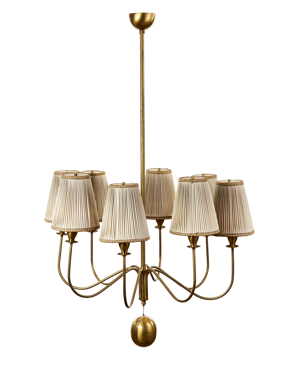 Lampada a sospensione a otto braccia in tubolare di ottone. Paralumi in stoffa, pendente ovoidale in ottone. Milano, anni '40. (h cm 162) (lievi difetti e mancanze)