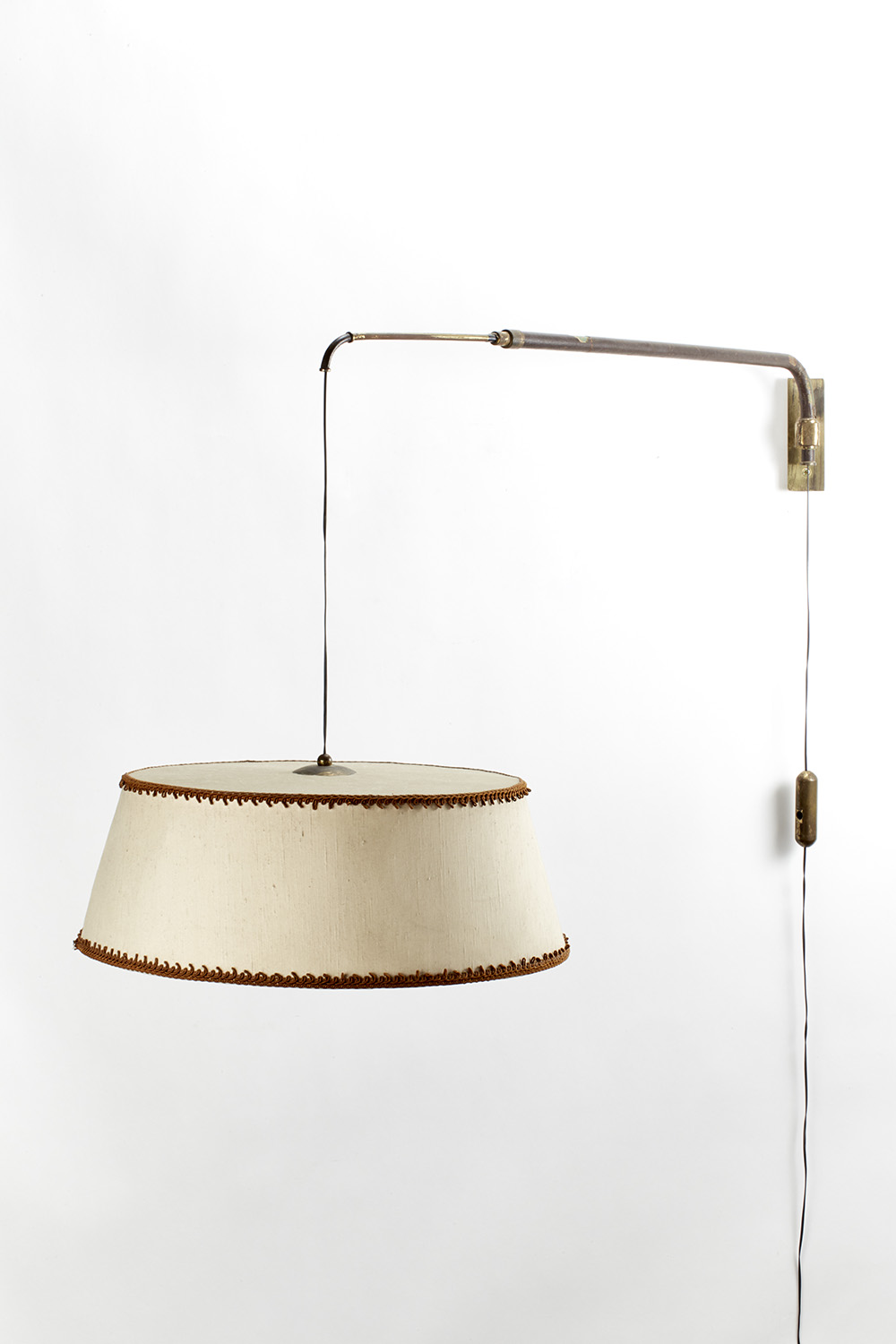 Wall lamp with telescopic arm with brass counterweight partially covered in leather, fabric lampshade. Milan, 1940s. (l max 150 cm) (defects)