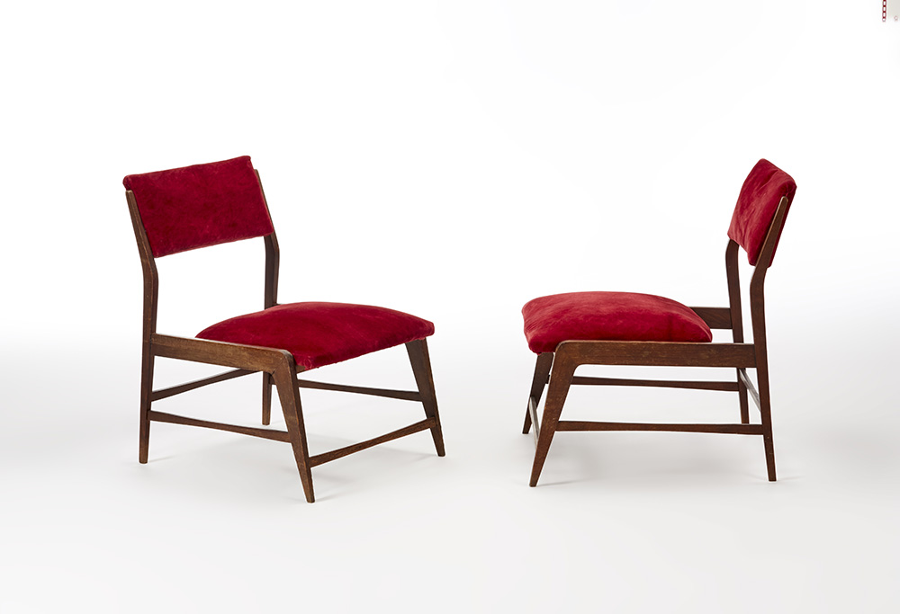 Coppia di poltroncine da camera in legno di noce massello con seduta e schienale imbottiti rivestiti di velluto rosso. Italia, anni '50. (cm 51x72x63) (lievi difetti)