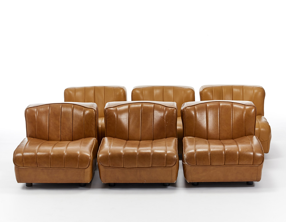 Lotto di sei poltrone imbottite rivestite in pelle ocra. Italia, anni '70. (lievi difetti)