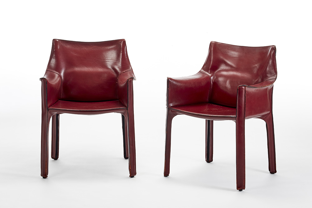 Due poltroncine modello "Cab 414". Produzione Cassina, Meda, 1982. Rivestimento in pelle bordeaux. (cm 58x80x47) (difetti)