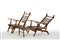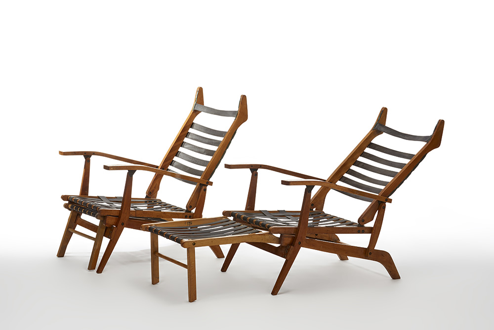 Pair of folding chaise longues in solid ash wood with seat and back in leather tape. Italy, 1940s/1950s. (67.5x92x160 cm.) (slight defects)