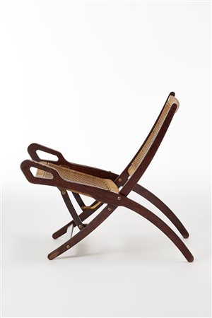 Poltroncina pieghevole modello "452 Ninfea". Agnosine (Brescia), anni '50. Struttura in legno massello e metallo, seduta e schienale impagliati. (cm 48x71,5x78) (lievi difetti)