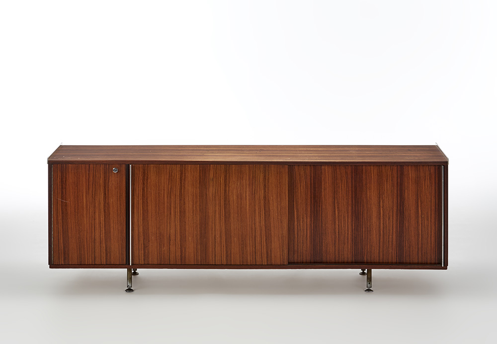 Indian rosewood veneered sideboard with aluminum and chromed metal handles and legs. Italy, 1950s. (180.5x62x42 cm.) (slight defects)