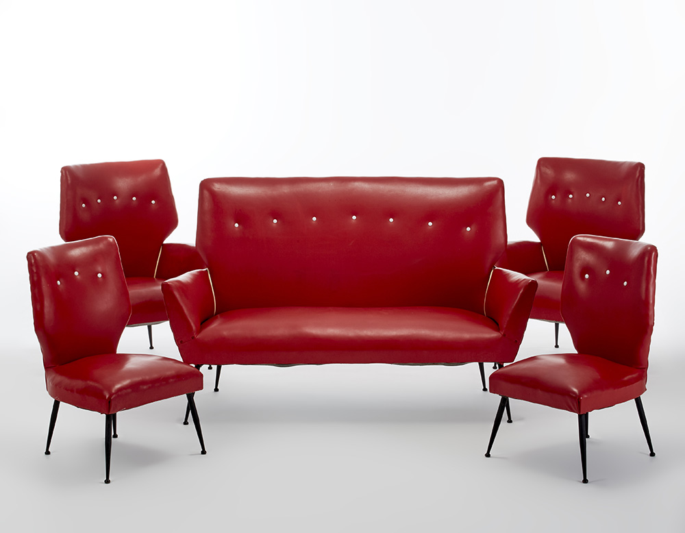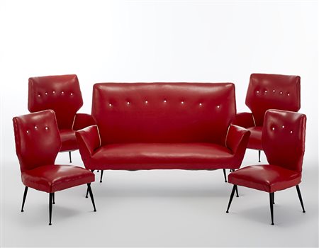 Salotto composto da divano due posti, coppia di poltrone e coppia di poltroncine. Italia, anni '60. Struttura in legno e metallo, gambe in ferro verniciato nero, rivestimento in skay di colore rosso vivo con bottoni bianchi. (Divano cm 140x84x60; poltrone cm 73x84x60; poltroncine cm 45x74x52,5) (lievi difetti)