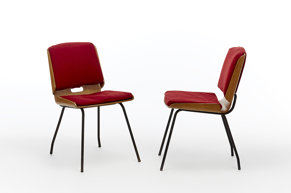 Coppia di poltroncine modello "Lucania". Produzione Arflex, Milano, 1954. Gambe in tondino di ferro verniciato nero, seduta e schienale in compensato, cuscini con rivestimento originale in panno rosso. (cm 43x73x50) (lievi difetti)
