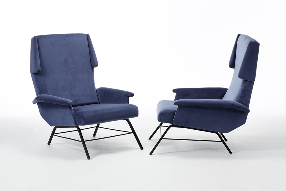Coppia di poltrone imbottite rivestite in velluto blu, con gambe in profilato metallico verniciato nero. Italia, anni '60. (cm 62x87x62) (lievi difetti e restauri)
