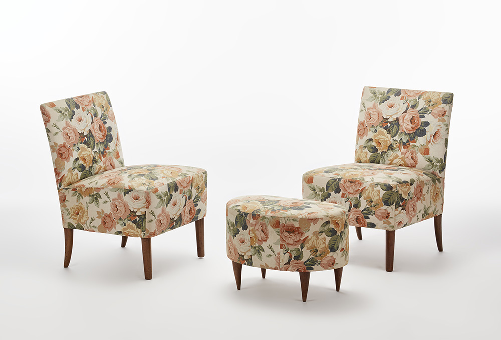 Lotto composto da due poltroncine da camera con struttura in mogano massello rivestite in tessuto floreale unite a un pouf di fattura analoga. Anni '60. (Poltrone cm 52x76x60; Pouf cm 57x38x34) (difetti e restauri)