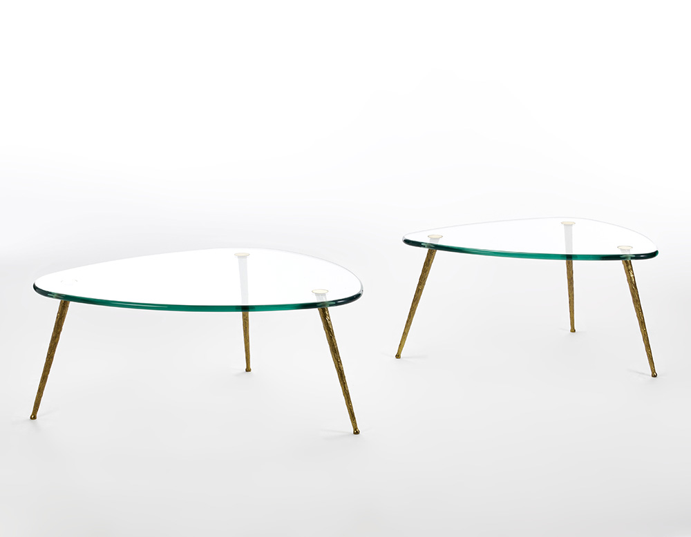 Coppia di tavolini con piano in cristallo molato di forma triangolare con angoli smussati e tre gambe in fusione di ottone con superficie imitante la corteccia vegetale. Italia, anni '50. (cm 93x40,5x72,5; cm 82x40,5x59) (lievi difetti)