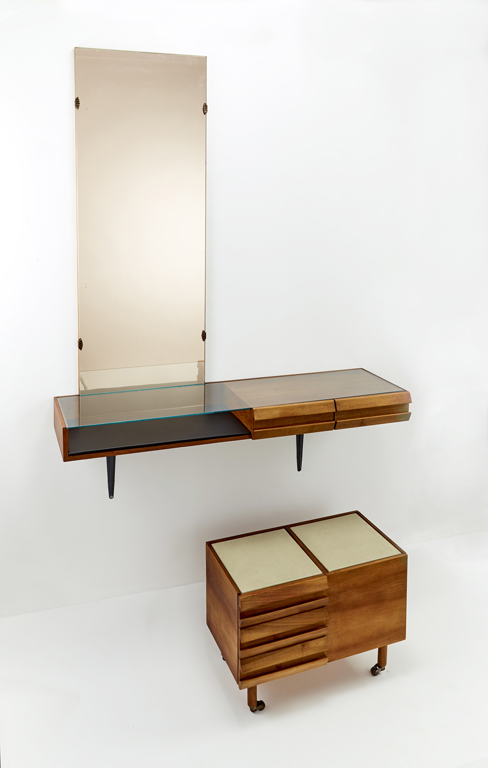 Set da toilette composto da un piano pensile con due cassetti nella fascia e specchiera in legno di teak massello e pelle nera abbinato a un mobiletto a rotelle con tre cassetti e un vano a pozzetto in legno di teak massello e pelle beige. Italia, anni '60. (Piano pensile: cm 119x11x30; specchiera: cm 130x47; mobiletto: cm 60x45x32) (lievi difetti)