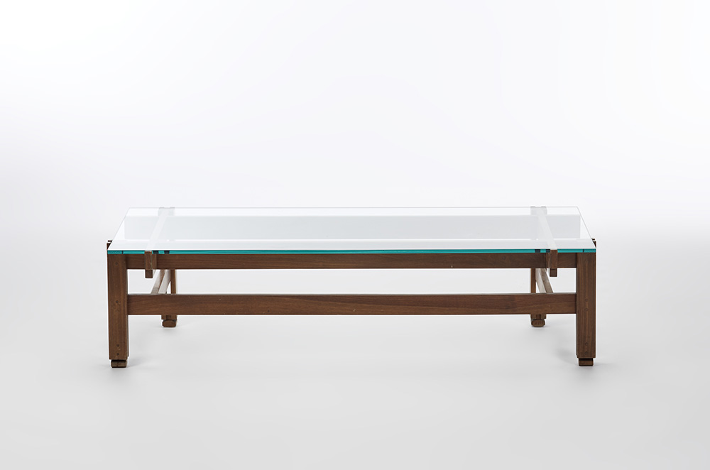 Tavolino da salotto modello "751". Produzione Cassina, Meda, 1962. Struttura in legno di noce massello, e piano in cristallo molato. Recante etichetta adesiva del produttore. (cm 130x35x57) (lievi difetti)