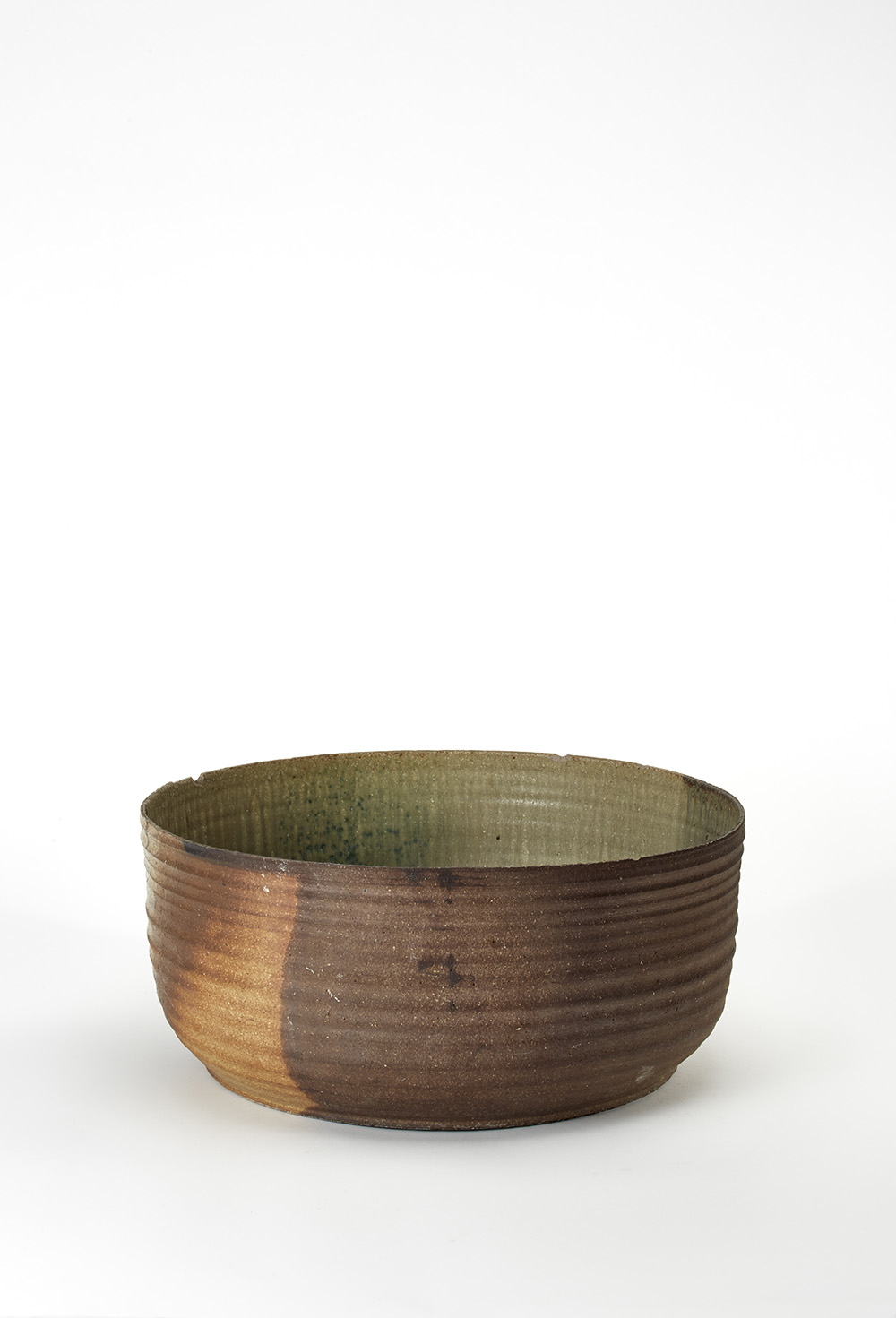 Grande vaso lavorato al tornio in terracotta smaltata a colature nei toni del bruno, del verde e del beige. Manifattura Ceramiche Arcore, anni '70. Marcato CA sotto la base. (h cm 20; d cm 45) (difetti e restauri)