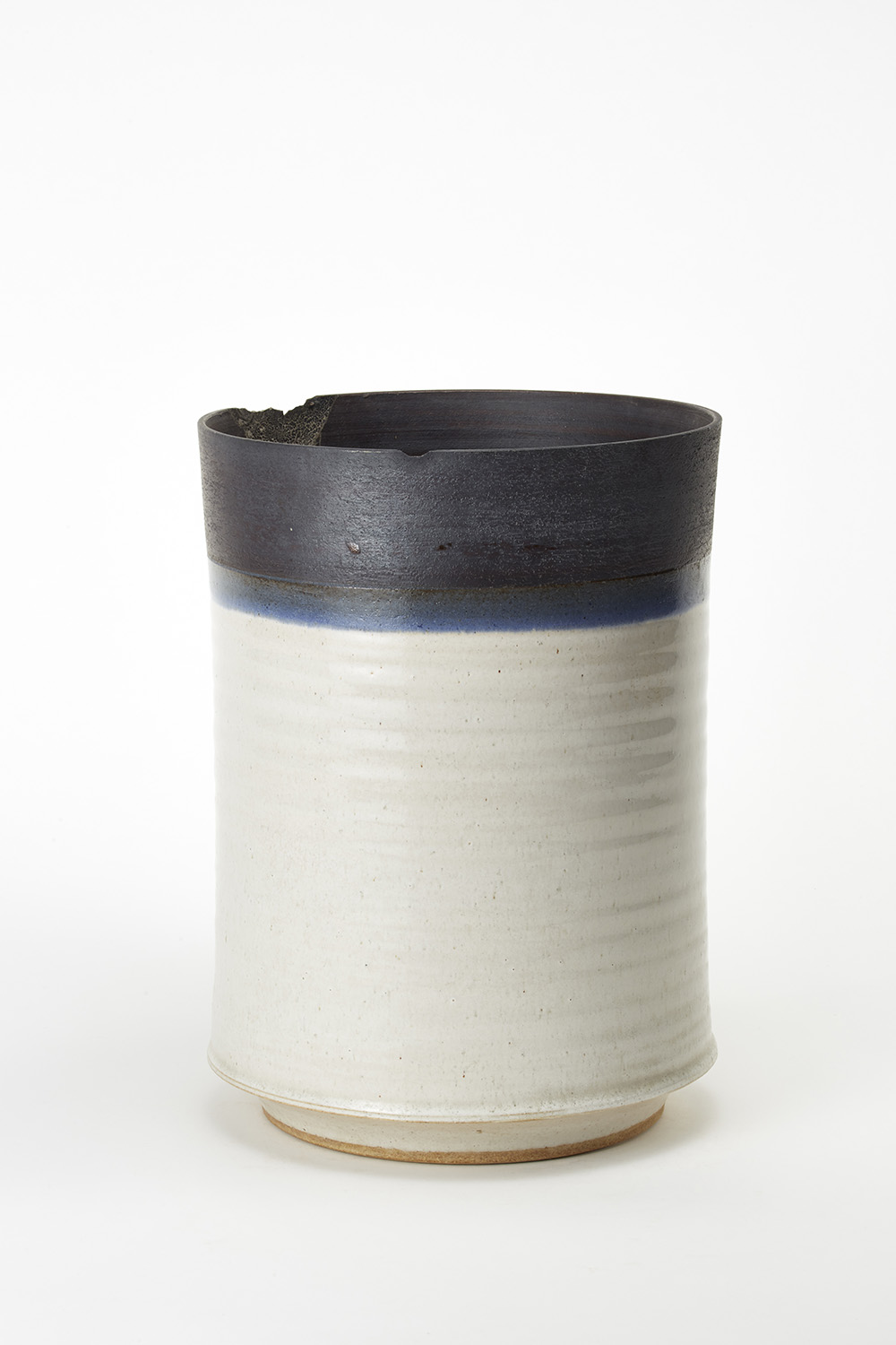 Grande vaso lavorato al tornio in terracotta smaltato nei toni del bruno, del bianco e del celeste. Manifattura Ceramiche Arcore, anni '70. Marcato CA sotto la base. (h cm 39,5; d cm 29) (difetti)