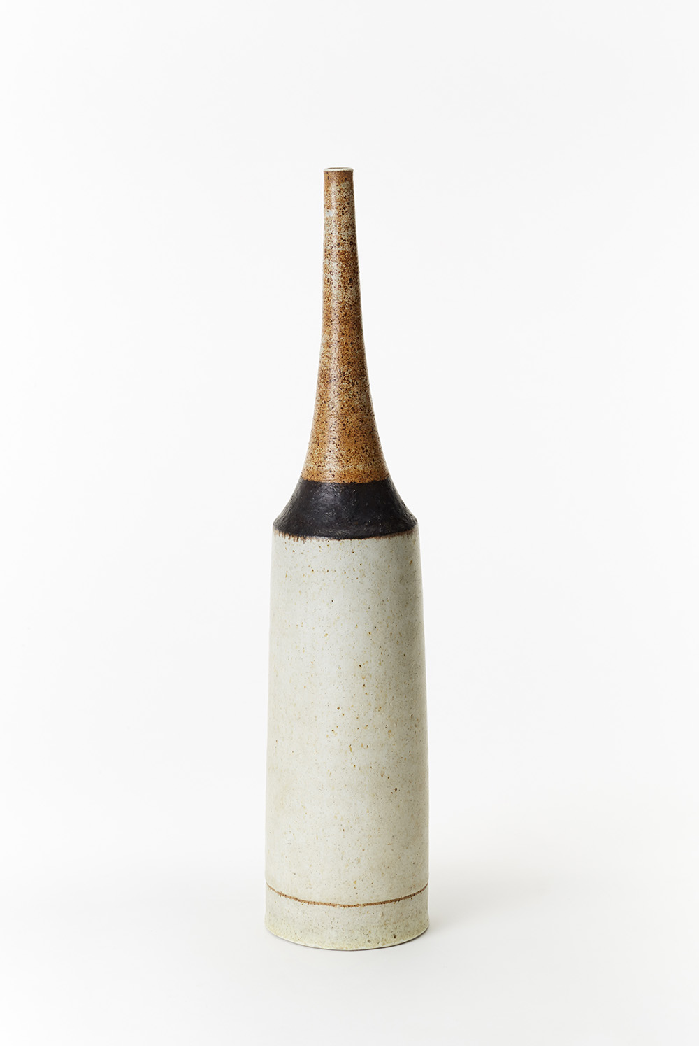 Bottiglia in gres smaltato in créme, marrone scuro e chiaro. Italia, anni '70'/80. Firmato sotto la base "GAMBONE ITALY". (h cm 57)