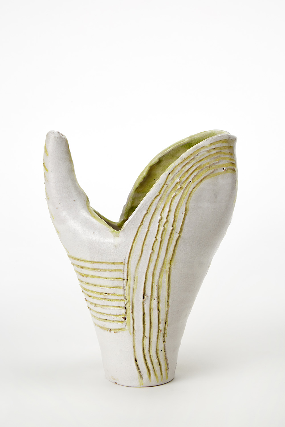 Vaso a valva in ceramica invetriata smaltata in bianco e giallo con decori graffiti sulla superficie esterna. Vietri, anni '50. Firmato sotto la base "Gambone Italy" e con il simbolo grafico dell'asinello. (h cm 30) (lievi difetti)