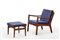 Poltrona con pouf. Produzione France & Son, Danimarca, anni '60. Struttura in legno di teak massello e cuscini rivestiti in tessuto azzurro. Recante marchio del produttore. (poltrona: cm 68x78x73; pouf: cm 54x38,5x47,5) (lievi difetti)