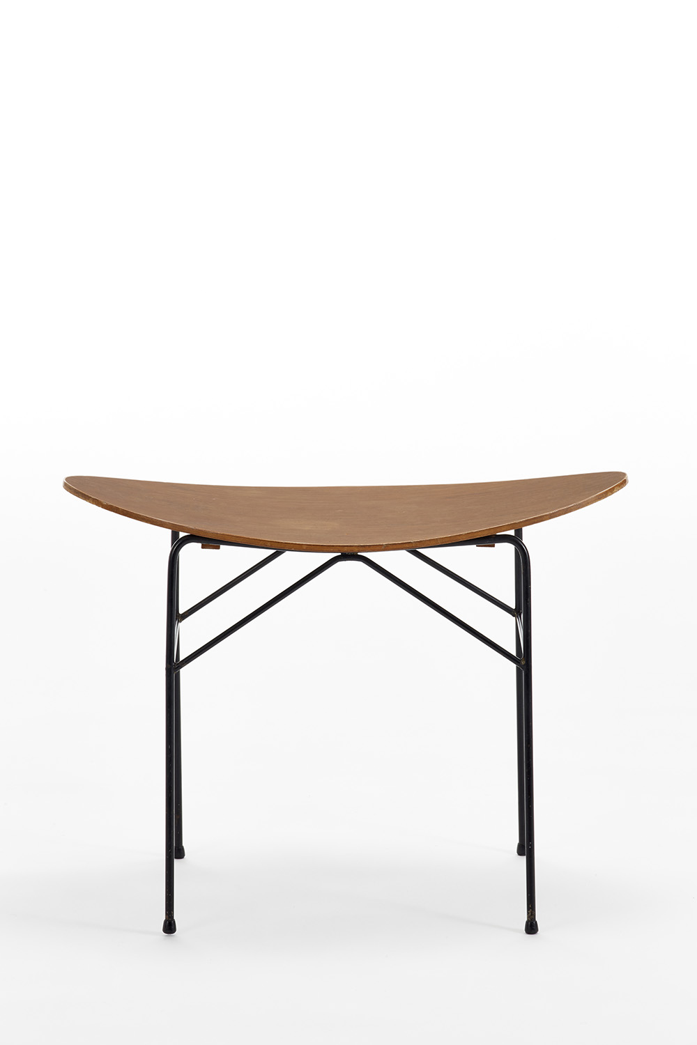 Small table model "Corona". Produced by Ulferts Mobler, Sweden, 1950s/1960s. Seat in curved teak plywood and structure in black painted metal rod. Marked under the seat. (63x49x31.5 cm.) (slight defects)