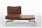 Divanetto a due moduli. 1969. Seduta singola rivestita in similpelle marrone e tavolino impiallacciato in noce; struttura in fusione di alluminio e acciaio con verniciatura nera corrugata. Modello progettato per la sala d'attesa dell'aeroporto internazionale di Ginevra. (cm 130x75x65) (lievi difetti)