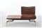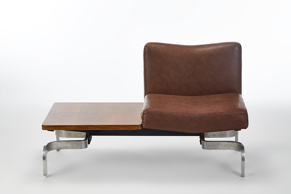 Divanetto a due moduli. 1969. Seduta singola rivestita in similpelle marrone e tavolino impiallacciato in noce; struttura in fusione di alluminio e acciaio con verniciatura nera corrugata. Modello progettato per la sala d'attesa dell'aeroporto internazionale di Ginevra. (cm 130x75x65) (lievi difetti)
