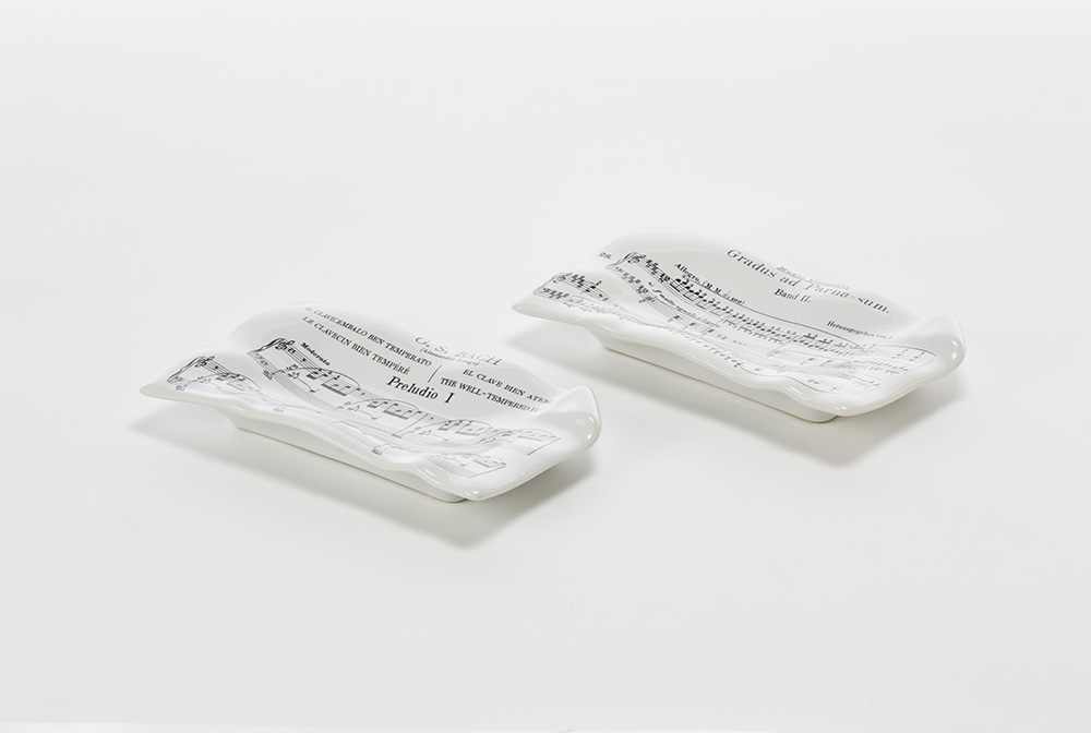Pair of ashtrays "Diagrammi musicali" in white porcelain decorated in black. Milan, 1980s/1990s. (22x14 cm.) (slight defects)
