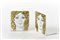 Due reggilibro "Visi con monete". Milano, anni '60. Metallo serigrafato in nero e dipinto a mano in oro. Prodotti per Banca Unione. (cm 13,5x15,3x10) (lievi difetti)
