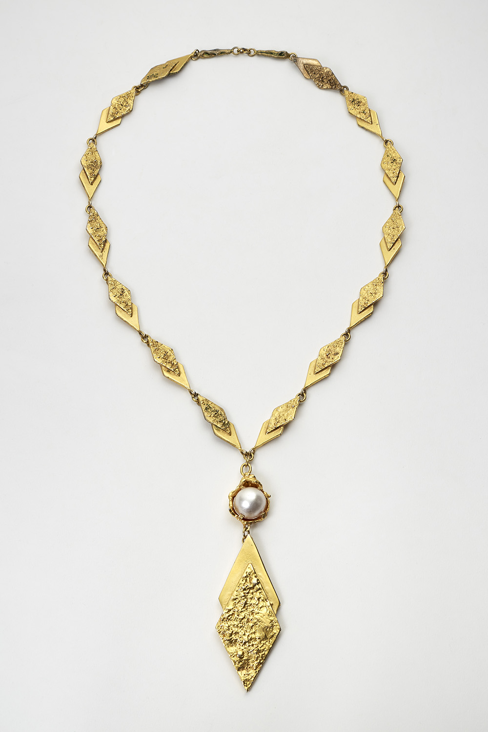 Collana "Rombi" della collezione "Gocce d'oro". Milano, 1974ca. Bronzo dorato a cera persa con perla australiana. Firmata a incussione al retro del ciondolo "Gabriella Crespi". (l cm 80) (lievi difetti)