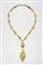 "Rombi" necklace from the "Gocce d'oro" collection. Milan, 1974ca. Lost wax gilded bronze with Australian pearl. Signed on the back of the pendant "Gabriella Crespi". (l 80 cm.) (slight defects)
