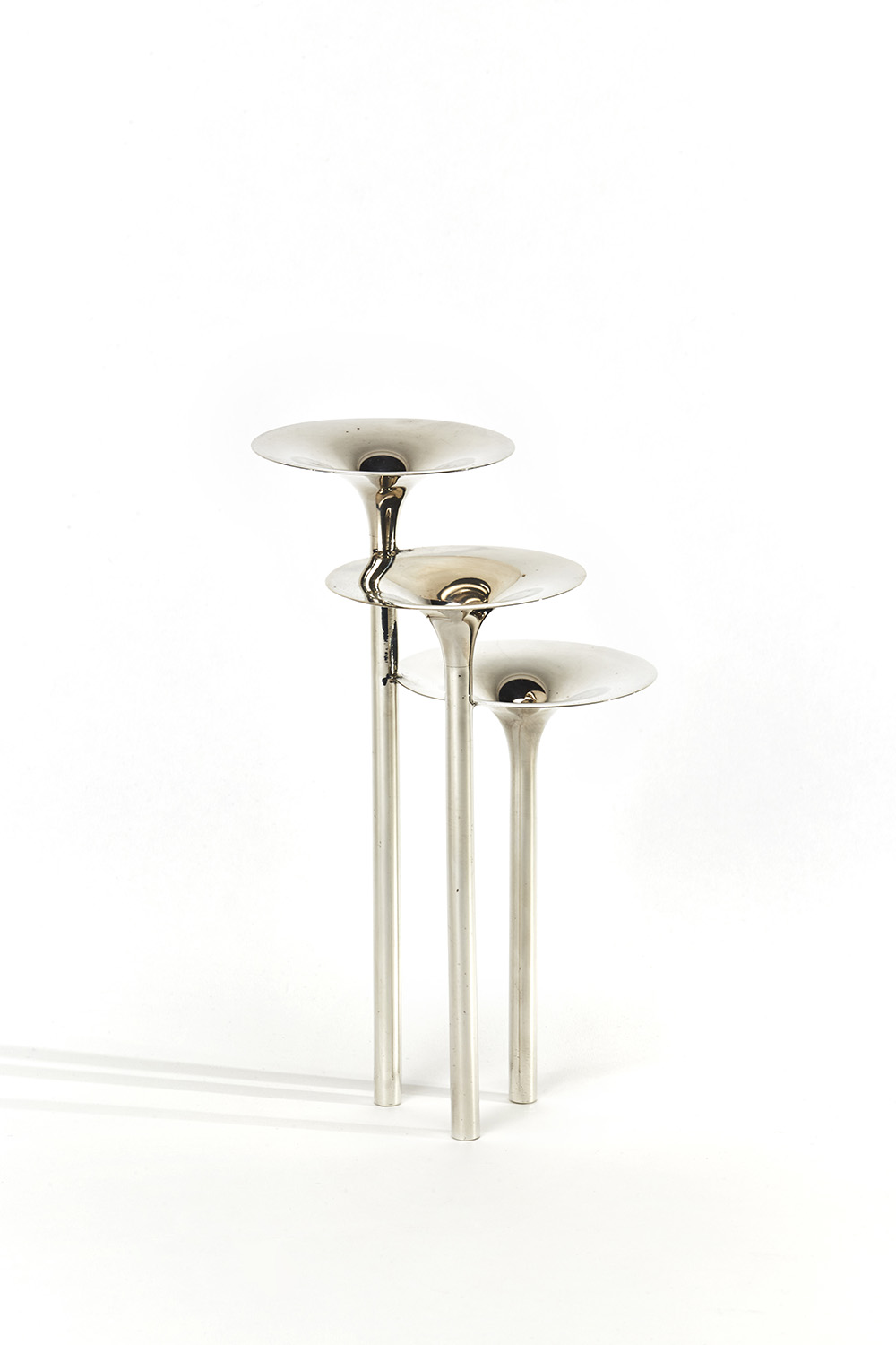 Candeliere modello "Concerto". Produzione Lino Sabattini-Atelier Christofle, 1960. Argento 900. Recante firma e punzoni illeggibili sotto uno stelo. (h cm 23,5) (lievi difetti)