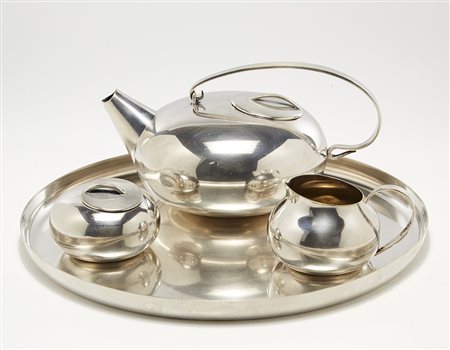 Servizio da te modello "Boule" composto da una teiera, una zuccheriera, una lattiera e un vassoio. Produzione Christofle, 1950, Italia/Francia. Metallo argentato. Marcato "PROD CHRISTOFLE ITALY" e "PROD CHRISTOFLE FRANCE". Un servizio del medesimo modello è esposto al MOMA di New York. (Misure diverse) (lievi difetti)