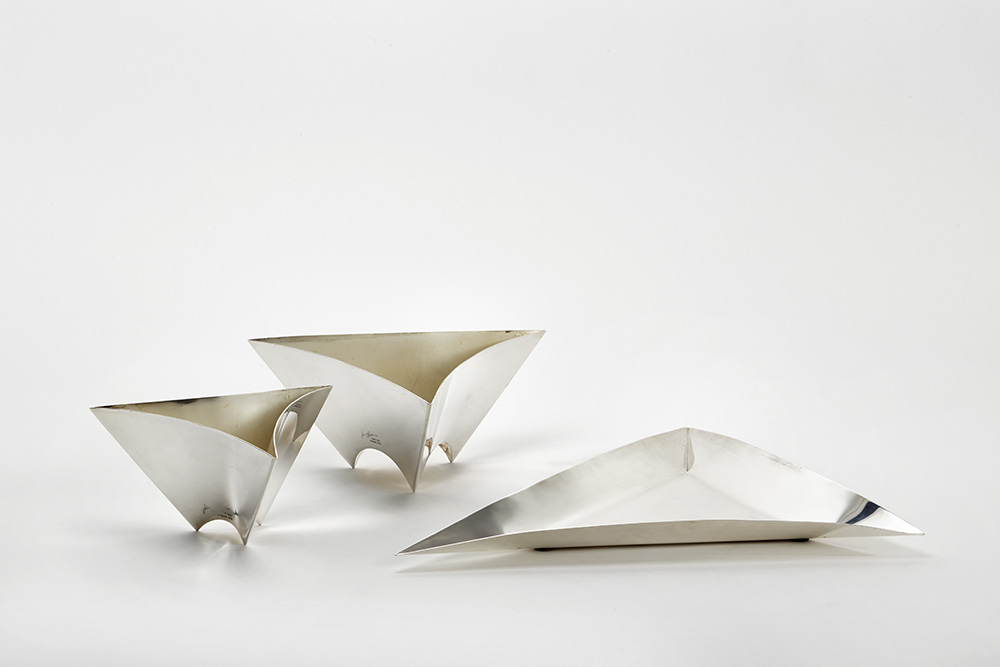 Two "Coppa Rialto" model centerpieces combined with a "Alzata Rialto" model tray. Bregnano, 2000. Silver metal. Signed and dated. (Different sizes) (slight defects)