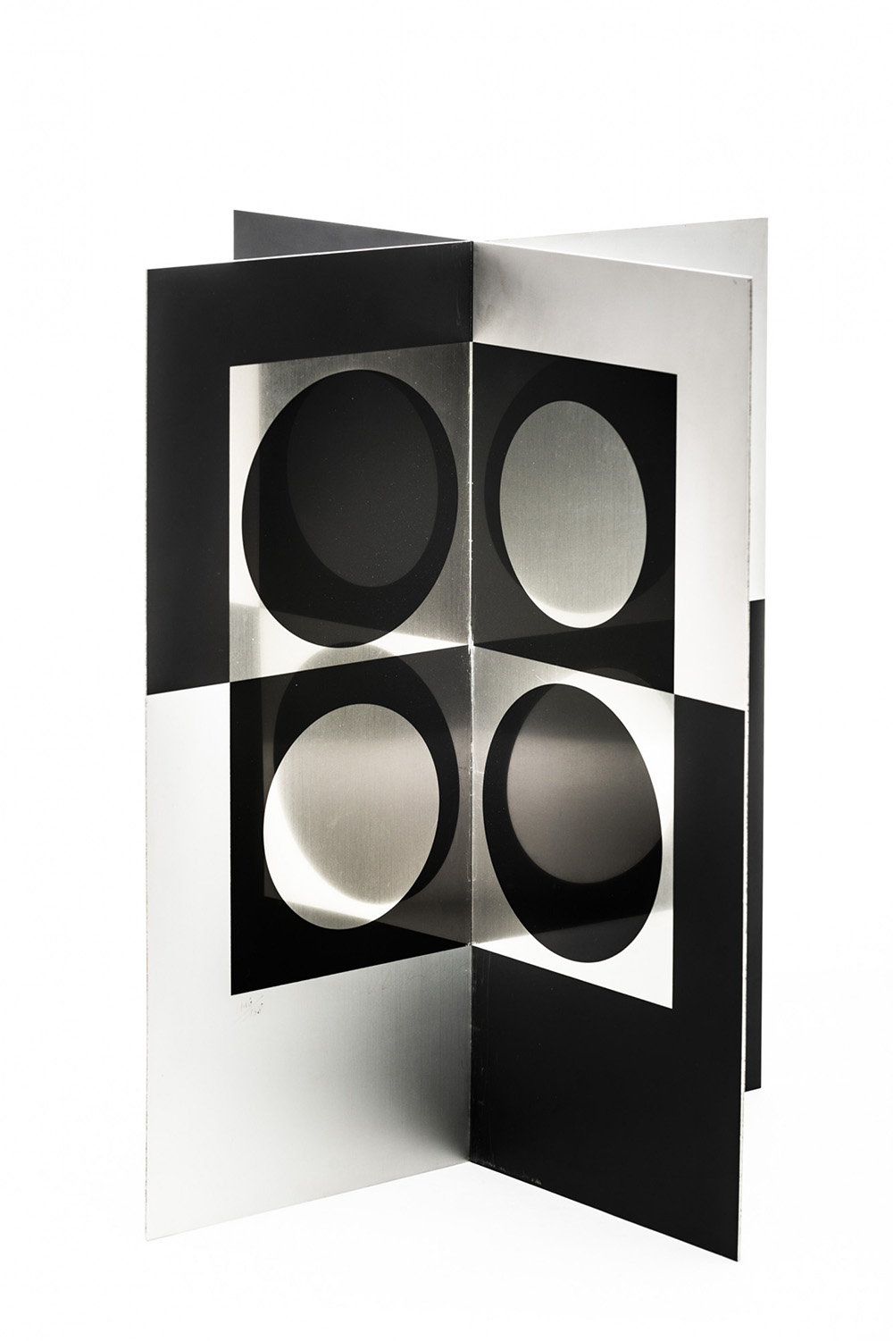 Victor Vasarely 1906 - 1997 René Descartes, Le discours de la Méthode - 1969 tecnica Multiplo, scultura in alluminio, 2 pezzi Dimensioni cm. 40 x 46 cad. Note contenuta in un cofanetto edito da Fequet e Baudier originariamente composta da 6 litografie - 14 serigrafie - 1 scultura cofanetto incompleto Opera n. 116/138 Provenienza Collezione Privata