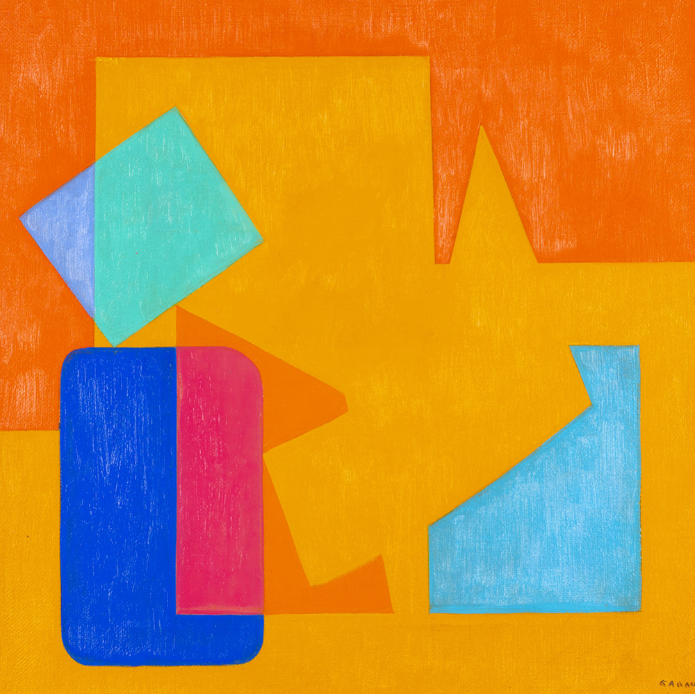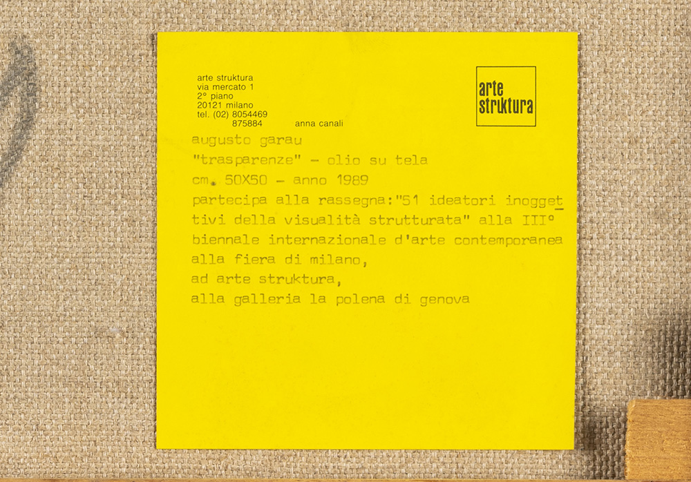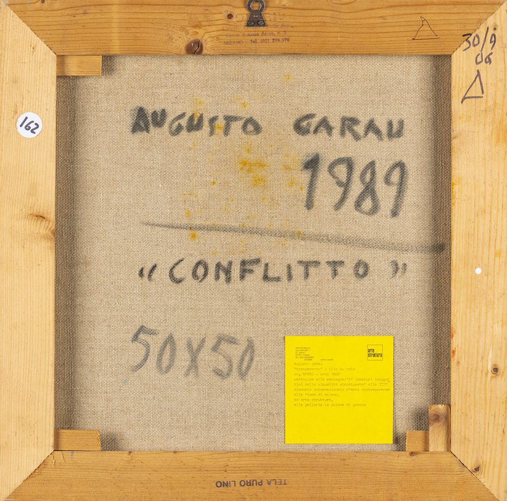 Augusto Garau 1923 - 2010 Il conflitto - 1989 tecnica Olio su tela Dimensioni cm. 50 x 50 Firma Firmato in basso a destra Note Etichetta Arte Struktura, Milano sul retro Provenienza Collezione Privata