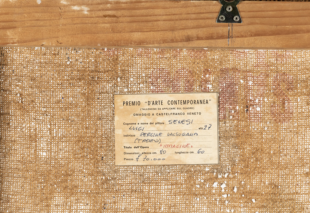 Luigi Senesi 1938 - 1978 Immagine - 1965 tecnica Tecnica mista e collage su tela Dimensioni cm. 82 x 60 Firma Firmato e datato in basso a destra Note Etichetta Premio “d’Arte Contemporanea” omaggio a Castelfranco Veneto, sul retro Provenienza Collezione Privata