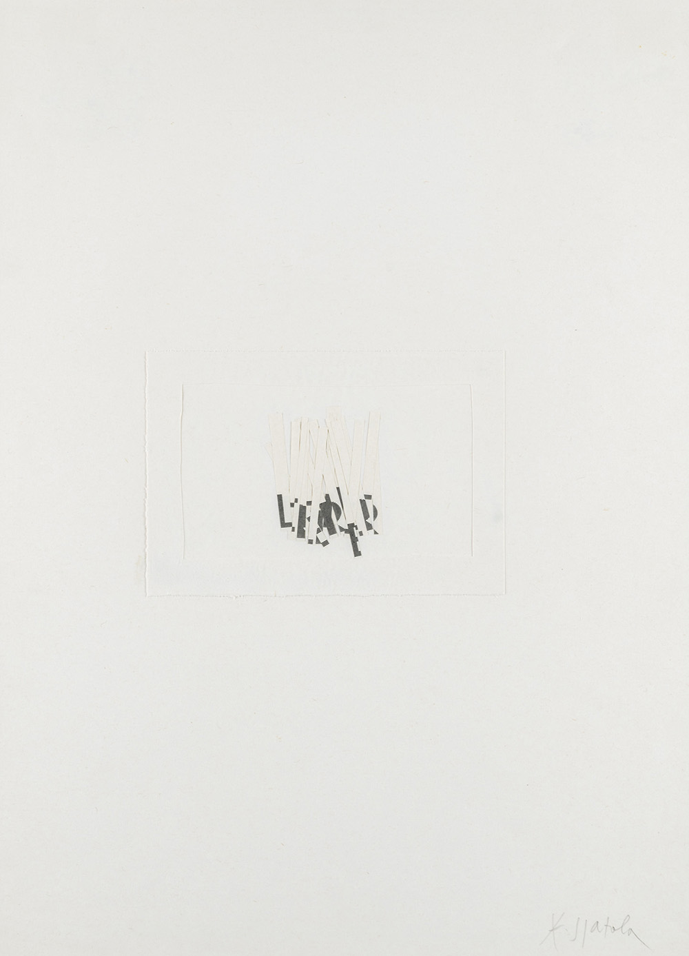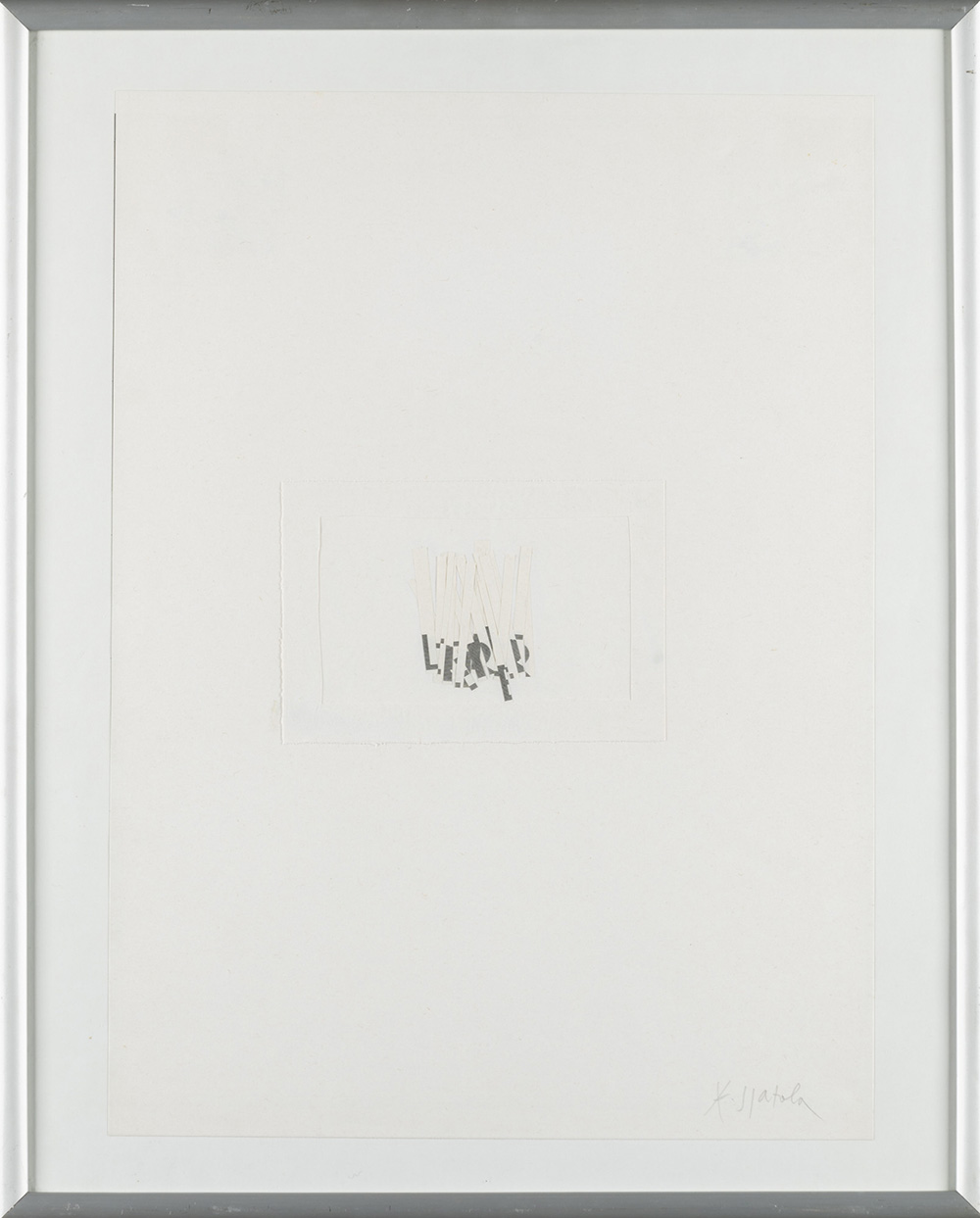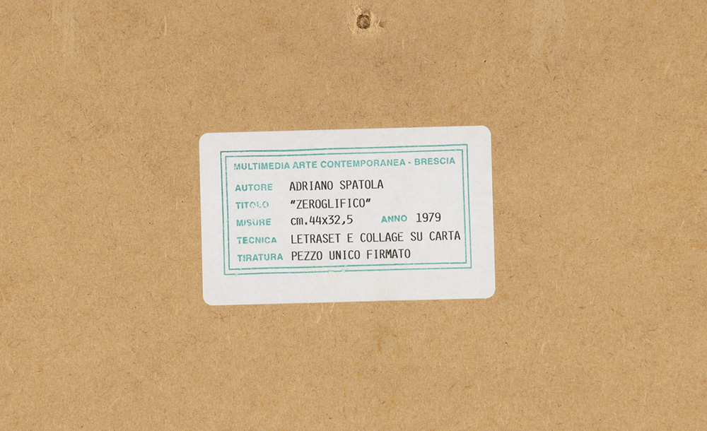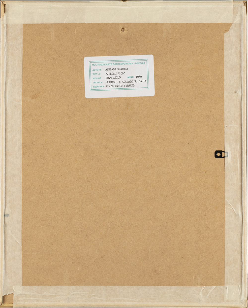 Adriano Spatola 1941 - 1988 Zeroglifico - 1979 tecnica Collage su carta Dimensioni cm. 44 x 32 (interno cm. 11 x 16) Firma Firmato in basso a destra Provenienza Galleria Multimedia Arte Contemporanea, Brescia Collezione Privata