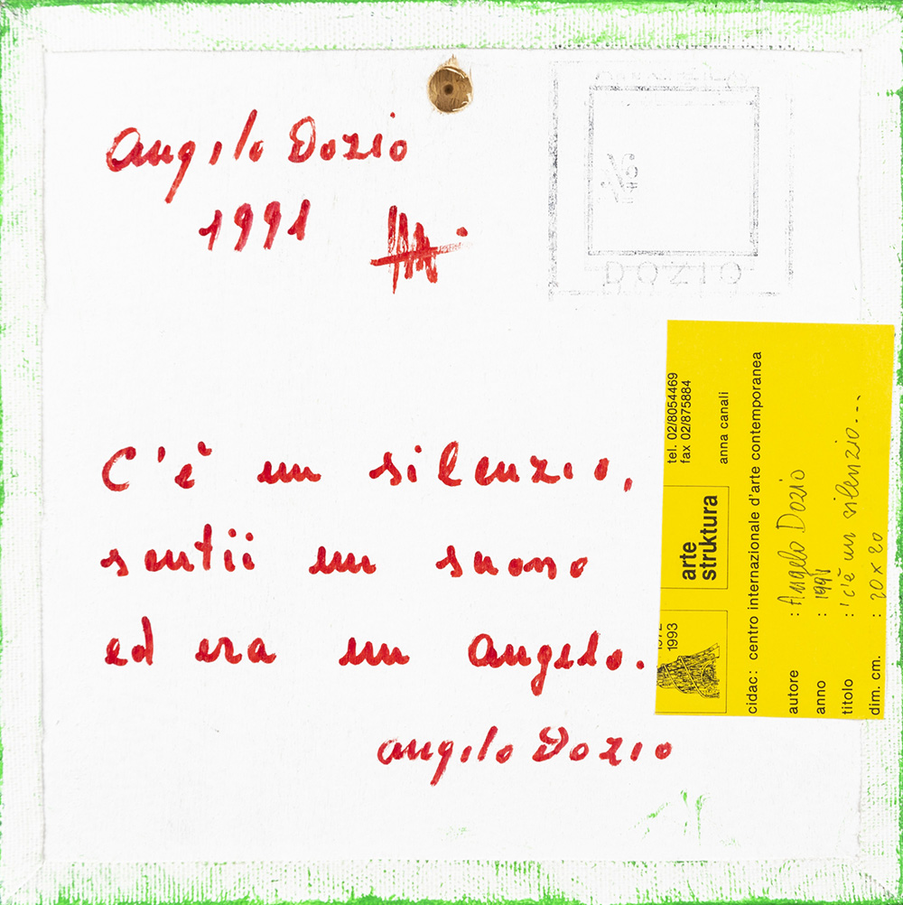 Angelo Dozio 1941 C’è un silenzio, senti un suono ed era un angelo - 1991 tecnica Acrilico su tela su tavola Dimensioni cm. 20 x 20 Firma Firmato e datato sul retro Note Timbro dell’artista sul retro Etichetta Arte Struktura, Milano sul retro Provenienza Collezione Privata