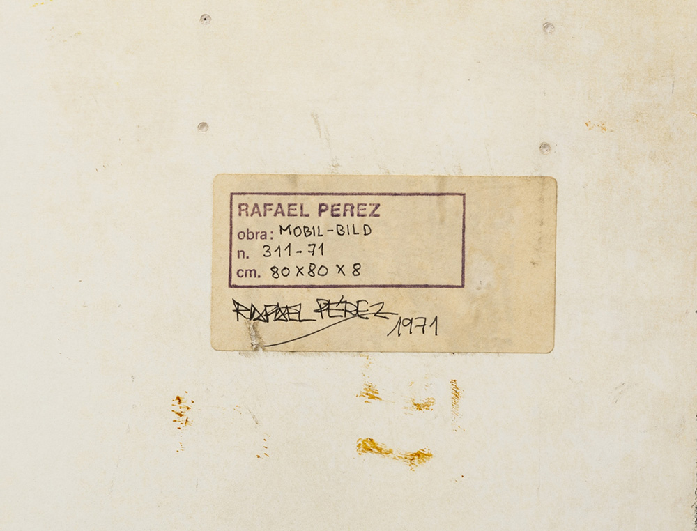 Rafael Perez 1938 Mobil-Bild - 1971 tecnica Tecnica mista su tavola e inserti in plexiglass Dimensioni cm. 80 x 80 x 6 Firma Firmato e datato sul retro Note Etichetta dell'artista sul retro Provenienza Collezione Privata