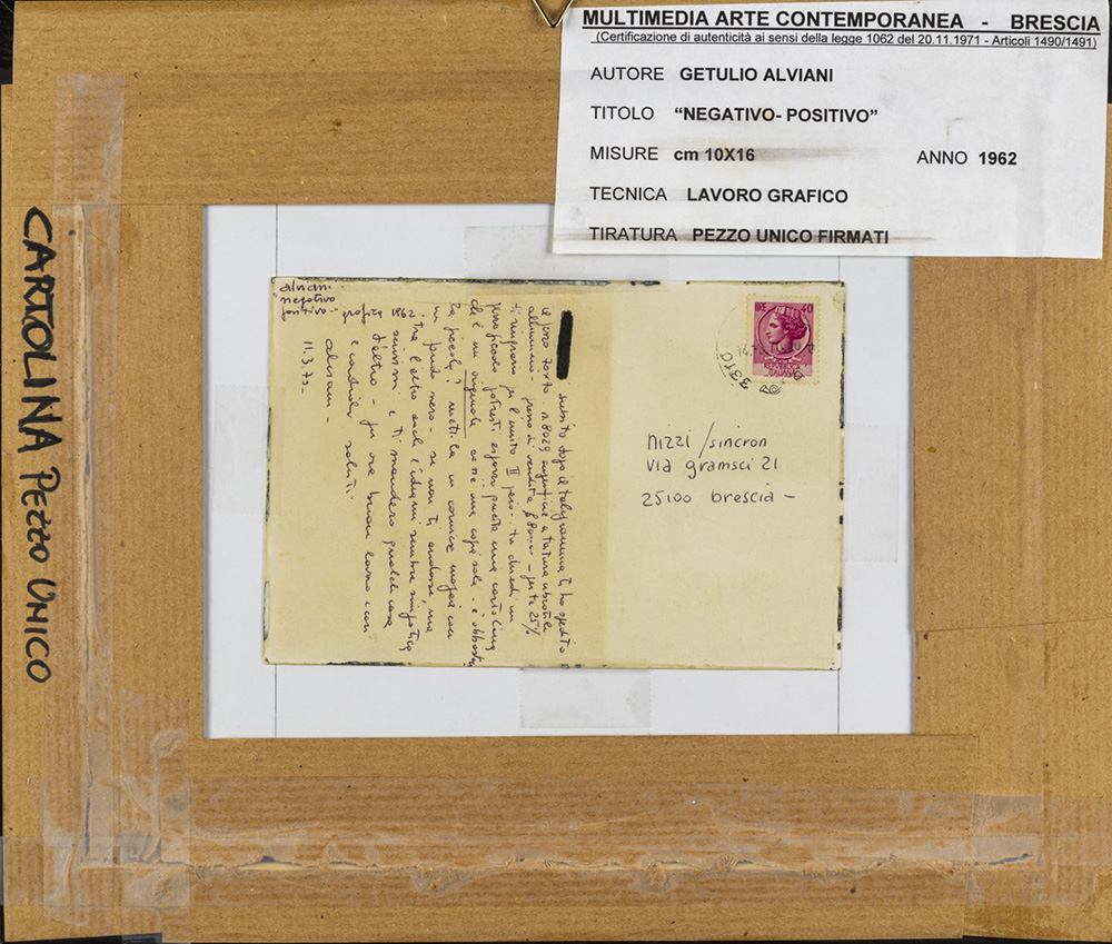 Getulio Alviani 1939 - 2018 Negativo-positivo - 1962 tecnica Tecnica mista su cartoncino Dimensioni cm. 10,5 x 16 Firma Firmato in basso al centro Note Iscrizione dell’artista sul retro Etichetta Multimedia Arte Contemporanea, Brescia sul retro Opera unica Provenienza Galleria Sincron, Brescia Galleria Multimedia Arte Contemporanea, Brescia Collezione Privata