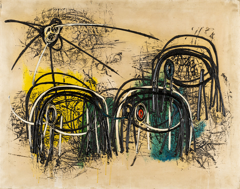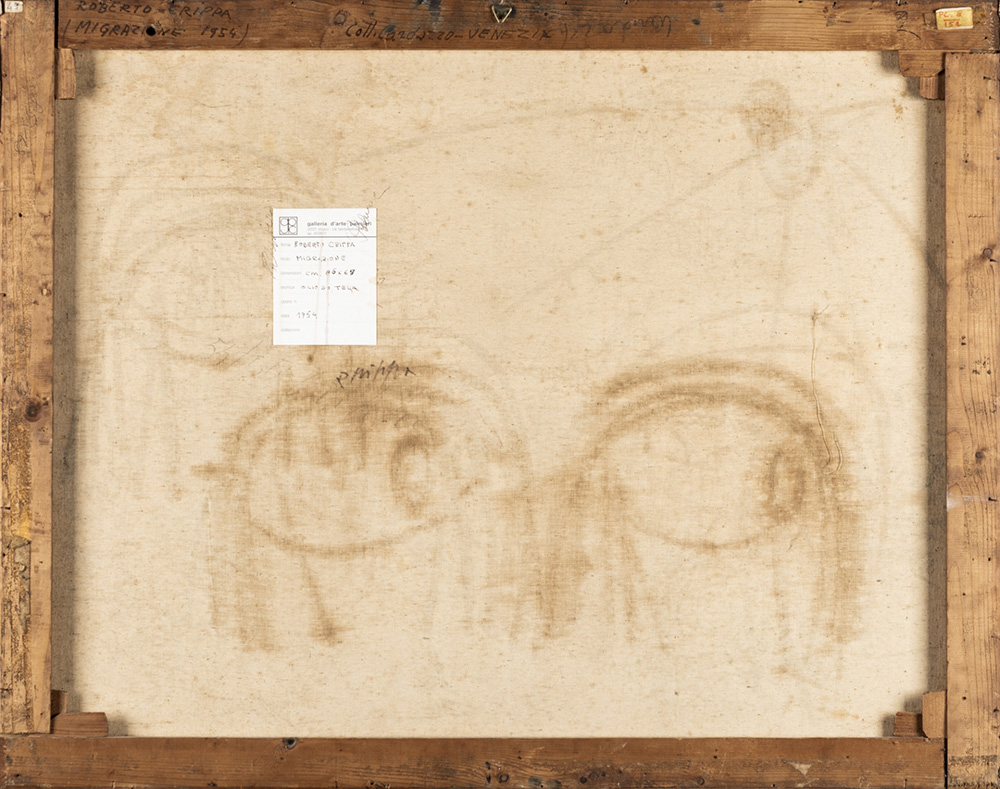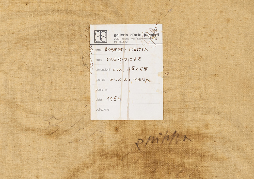 Roberto Crippa 1921 - 1972 Migrazione - 1954 tecnica Olio su tela Dimensioni cm. 68 x 85 Firma Firmato sul retro Documenti Certificato di garanzia e provenienza Galleria Palmieri, Milano Note Etichetta Galleria d’Arte Palmieri, Milano sul retro Provenienza Collezione Privata