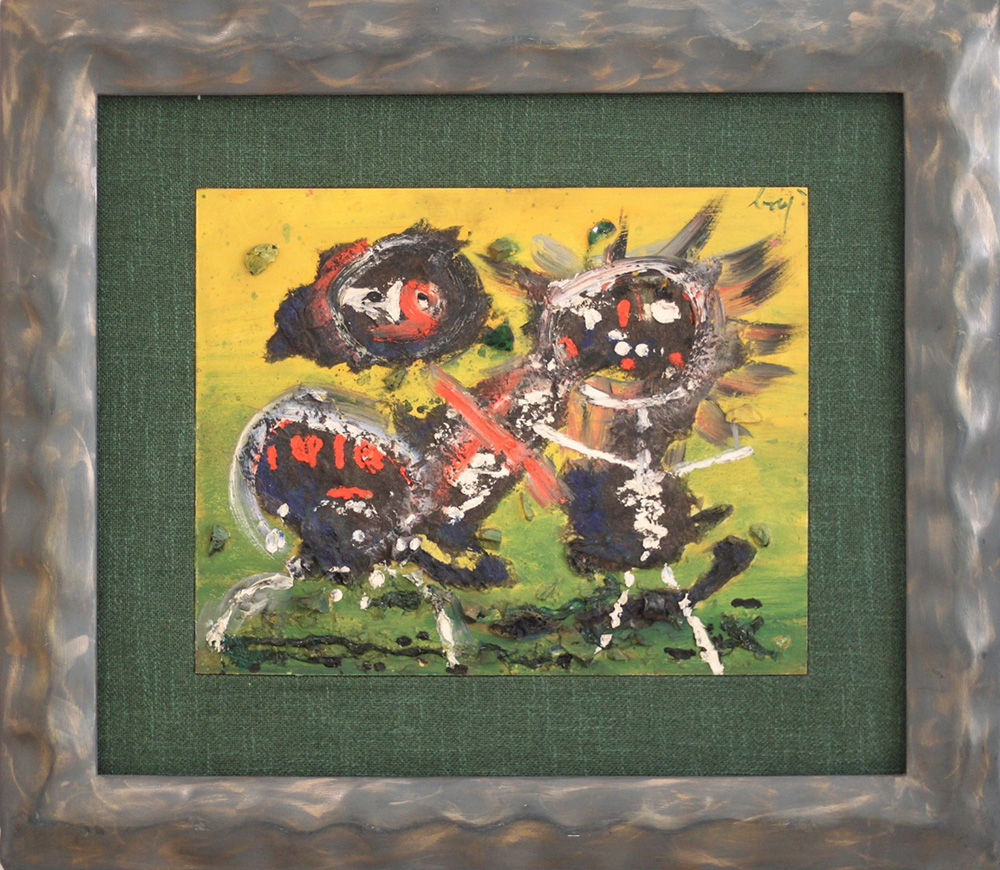 ENRICO BAJ Personaggi Olio e vetri su compensato Anno 1956 Dim. 40x50 Opera Archiviata al N. 285.A Autentica su foto a cura Roberta baj in data 22.01.2011 Firmato in alto a dx