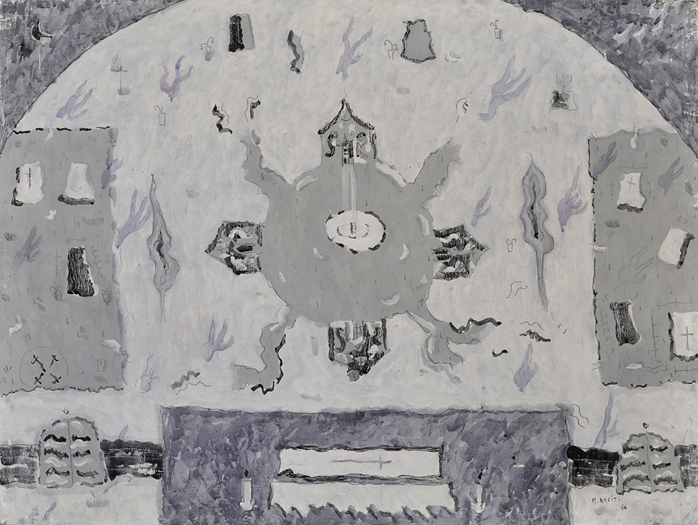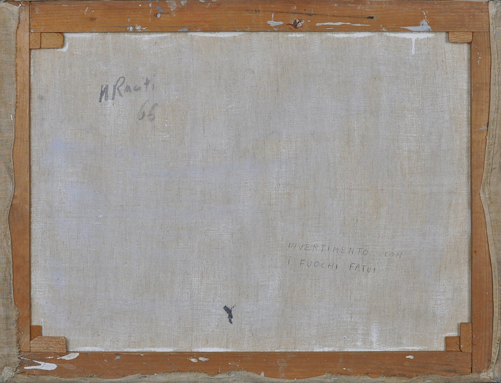 MARIO RACITI Divertimento con i fuochi fatui Olio su tela Anno 1966 Dim. 60x80 Al verso data, titolo e firma Datato e firmato in basso a dx