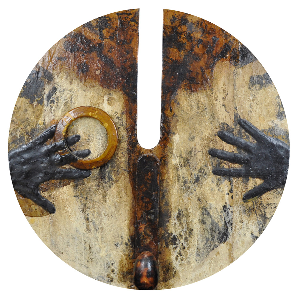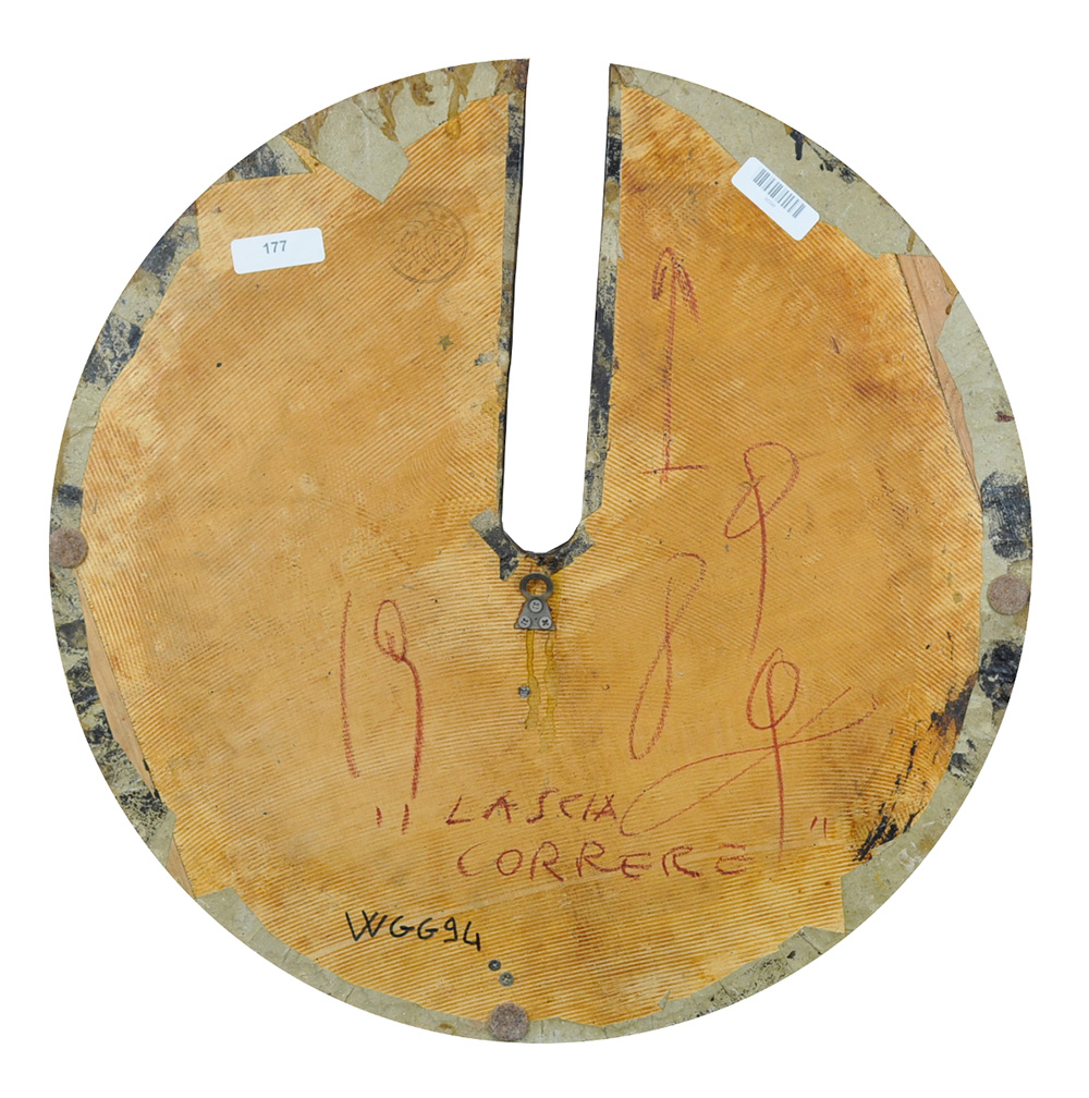 BRUNO CECCOBELLI Lascia correre Oggetti e tecnica mista su legno Anno 1989 Diam. 55 Autentica su foto dell'artista Opera archiviata presso Archivio generale opere Bruno Ceccobelli al N. M 26 in data 20/11/1995 Al verso data, titolo e firma