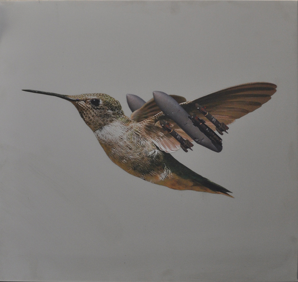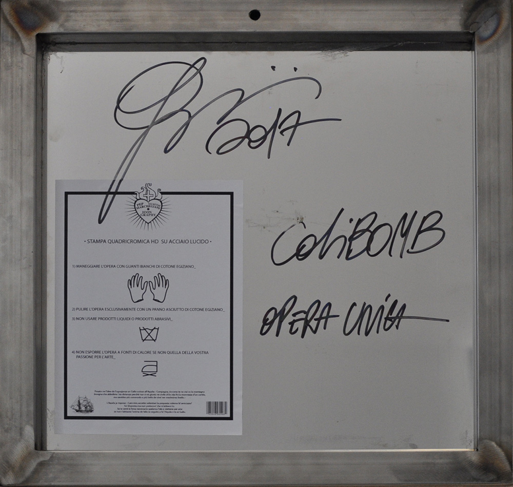 PEP MARCHEGIANI Colibomb Stampa quadricromica su acciaio mirror Anno 2017 Dim. 40x40x2,1 Opera accompagnata da certificato di autenticità Codice VM201740400059 Al verso adesivi istruzioni, firma, titolo, data e la dicitura "opera unica"